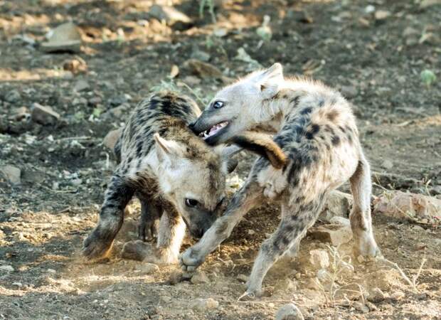 Дело в том, что каждый, действительно каждый, кто впервые видит этот снимок, думает, что на нем одна крупная гиена, которая широко раскрыла пасть и "улыбается".