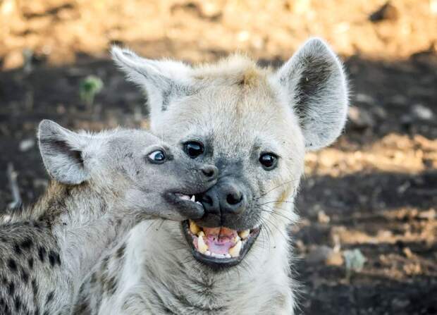 Снимок у Мулмана получился случайно. В какой-то момент детеныш полез к морде мамы, а она широко раскрыла пасть и две морды гиены "слились" в одну. Оптическую иллюзию сам фотограф заметил не сразу, а позже, когда рассматривал сделанные снимки.